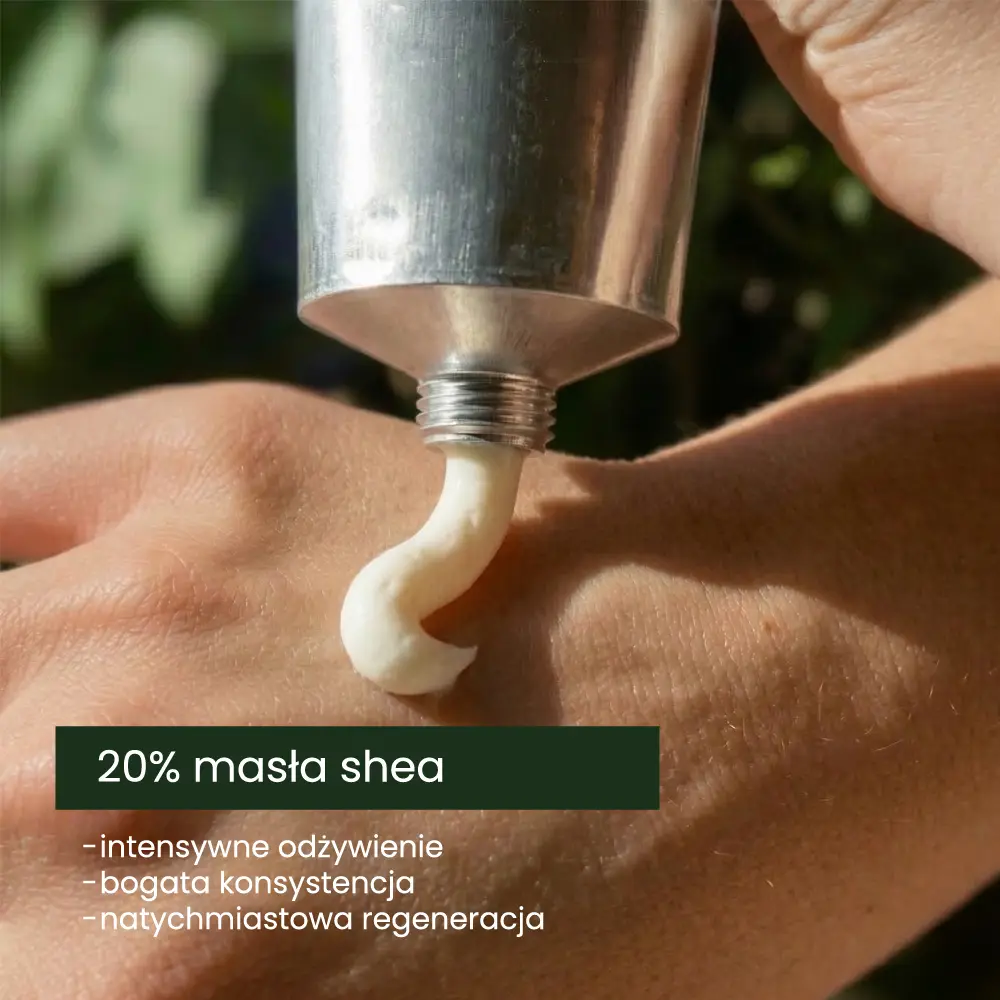 20% masła shea zapewnia intensywną regenerację, nawilżenie i ochronę skóry dłoni. Krem pomaga przywrócić komfort nawet wtedy, gdy skóra jest sucha, szorstka i potrzebuje więcej troski.